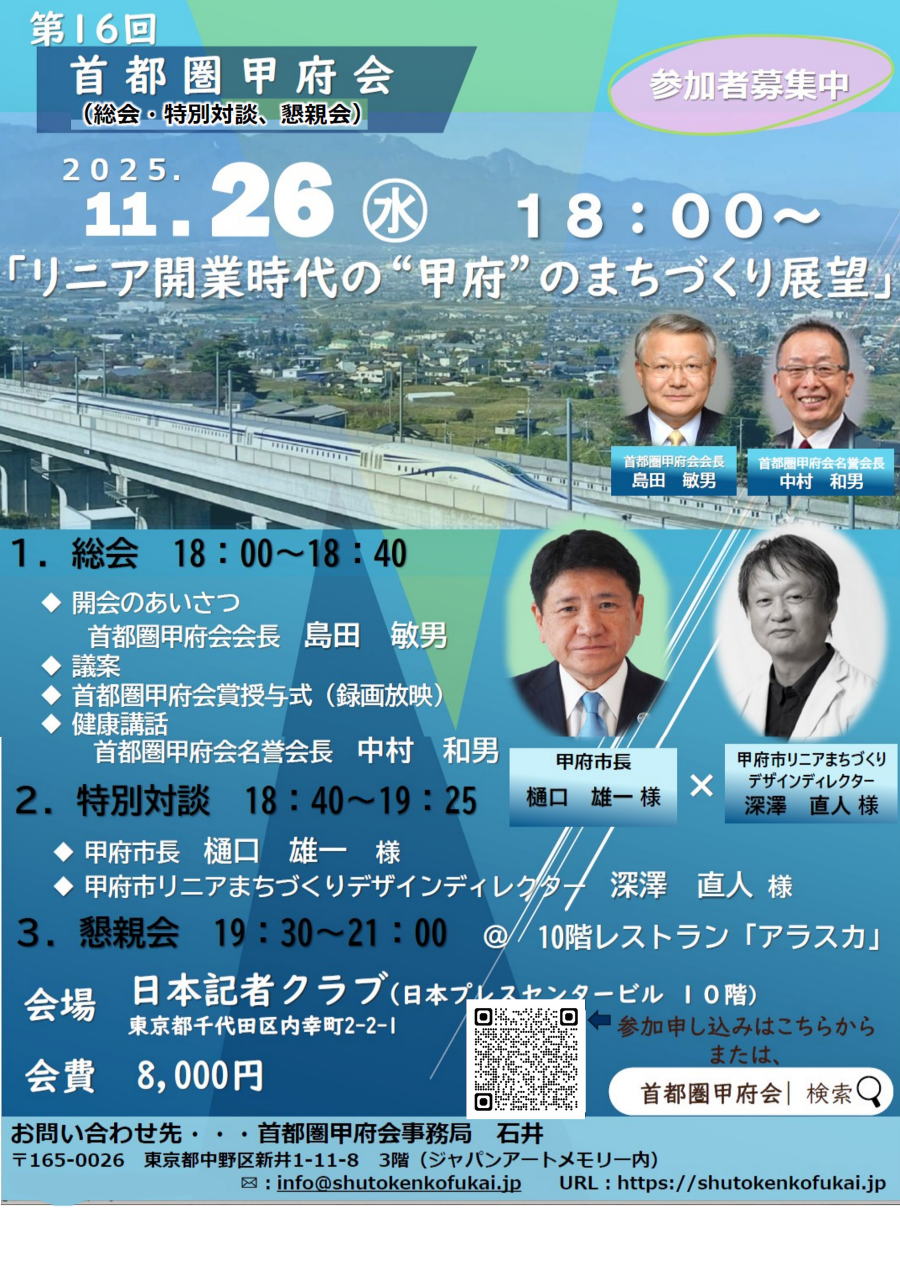 首都圏甲府会第16回総会・特別対談・懇親会 2025年度の総会・特別対談・懇親会は、11月26日(水)18時より、 日本記者クラブ(日本プレスセンタービル)にて開催します 首都圏甲府会第16回総会・特別対談・懇親会案内チラシ.pdf 参加申し込みはここをクリックしてください 首都圏甲府会賞授与式 2025年11月21日甲府市庁舎にて実施 表彰団体/表彰者は決定次第掲載